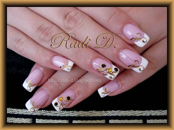 Starting up with the first one- it`s french with gold and black elements- swirls, and black and yellow rhinestones ->